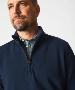 This half zip is standard fit. Model is 6’2″ wearing size medium.