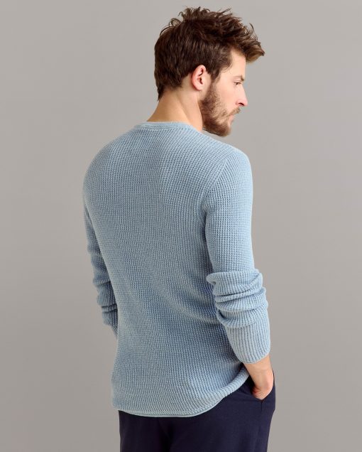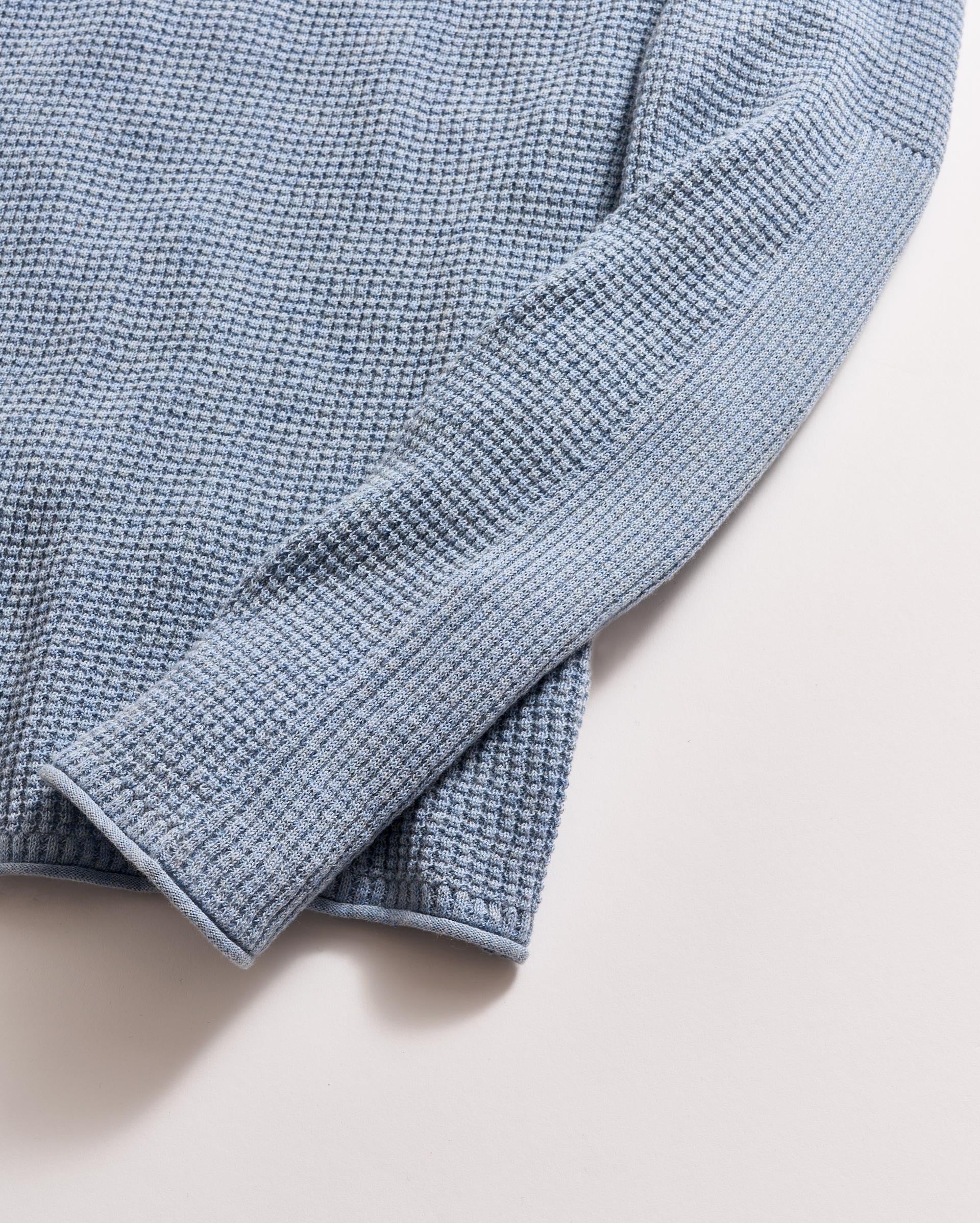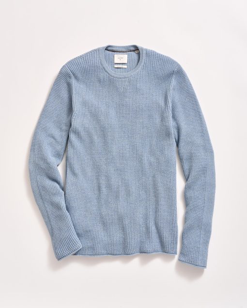 Our bestselling cotton-cashmere Mini Waffle Crew is ultra-soft, lightweight and features a reverse waffle weave at the elbows and jersey roll at the hem. It’s finished with thoughtful Billy Reid design details, like our signature heirloom ribbon stripe at the back neck. It’s a versatile transition piece that can effortlessly be worn alone or layered underneath a sweater or jacket.