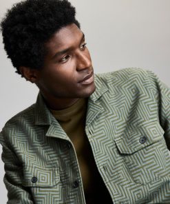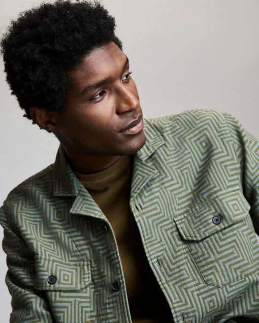 A luxe upgrade to the essential overshirt, this piece features a custom woven jacquard, featuring our seasonal Optical Illusion pattern, inspired by a handknit sweater. Crafted with a lightweight cotton in and a timeless camp collar in a relaxed fit, this layering piece looks smart over your favorite t-shirt or as an unexpected choice for a dressier look. Finished with refined details like top-stitched elbow patches, and antique brass snaps and tonal thread throughout.