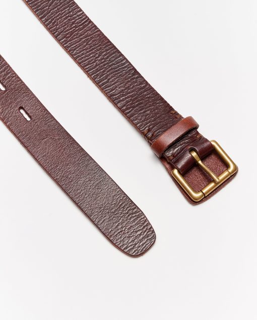 Our Uniform Leather Belt is a closet staple. It’s a one ¼” width cut from .5mm thick calfskin leather that withstands daily wear and only gets better with time. It’s finished with a square solid brass buckle, longer slots for belt holes, our signature heirloom ribbon stripe flag on the backside, and our smart backing detail that prevents the buckle from rubbing against the wearer’s pants.