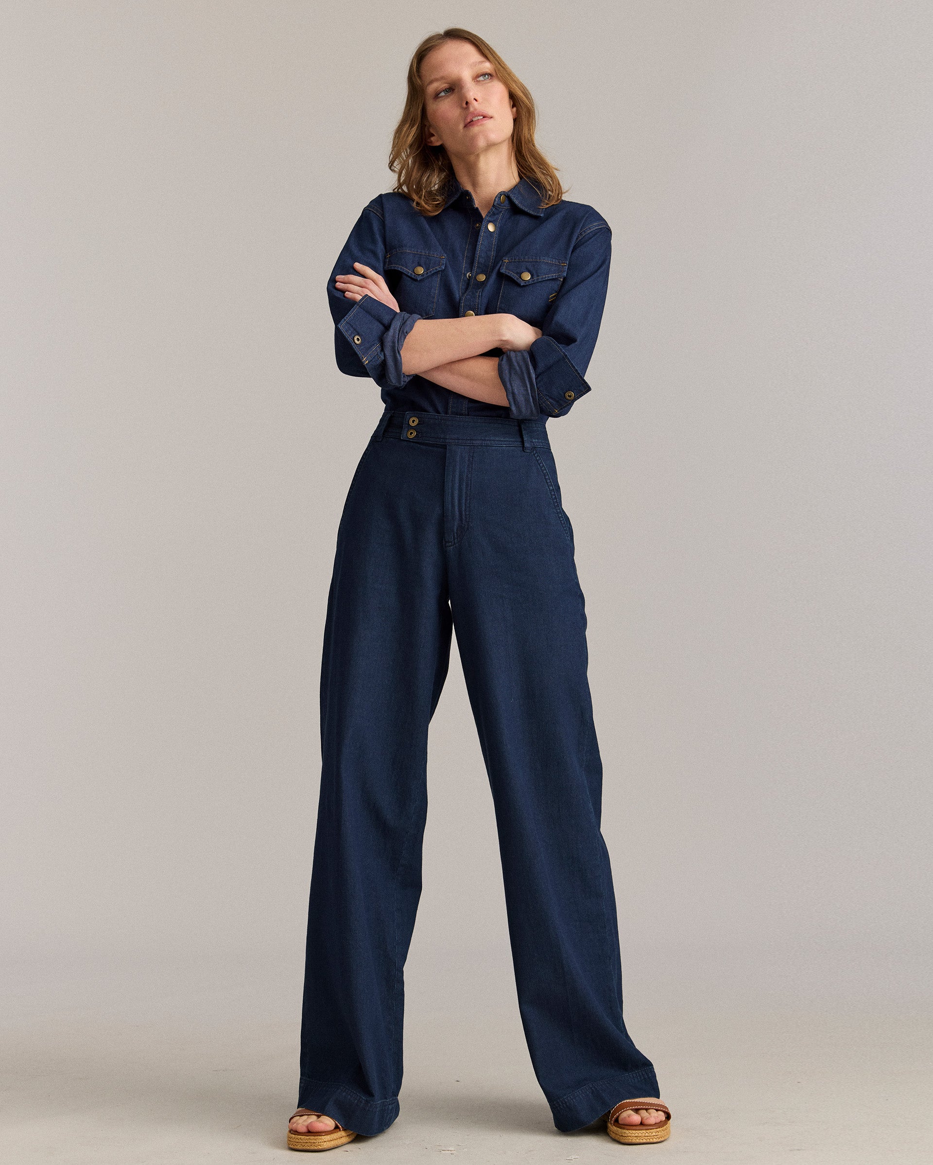 Wider leg trousers are everywhere—from the runway to the everyday. We’re bringing that same style to our new collection with the Denim Wide Leg Trouser. The wide-cut, generous proportion allows for more flexibility and proportion to pair it with a range of looks. It fits like an extension of the tab trouser and elevates the denim from being a simple jean into a more polished silhouette so you can dress it up or down for any occasion.