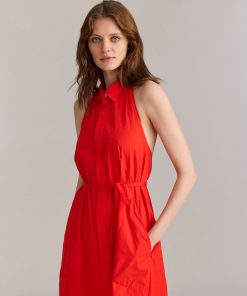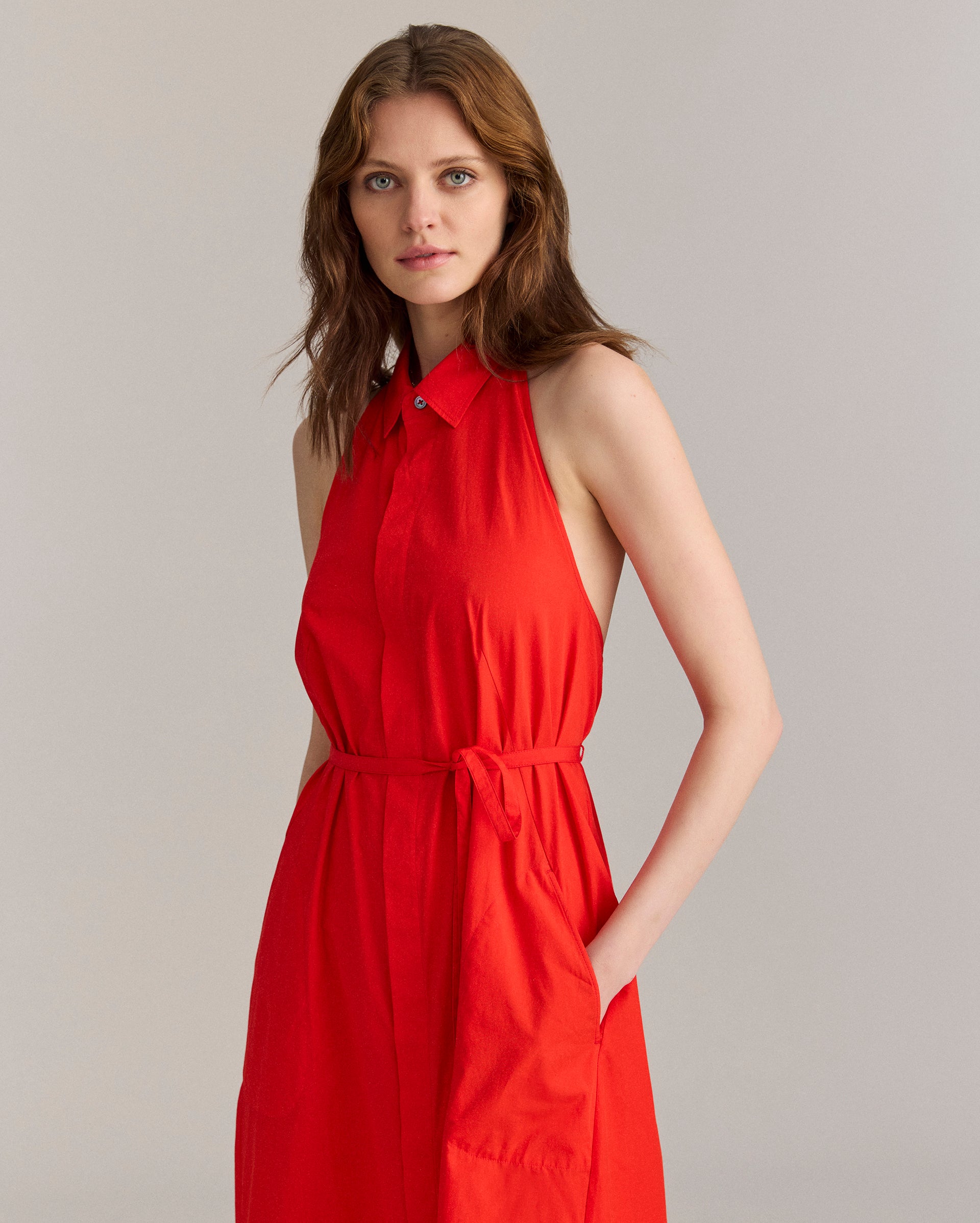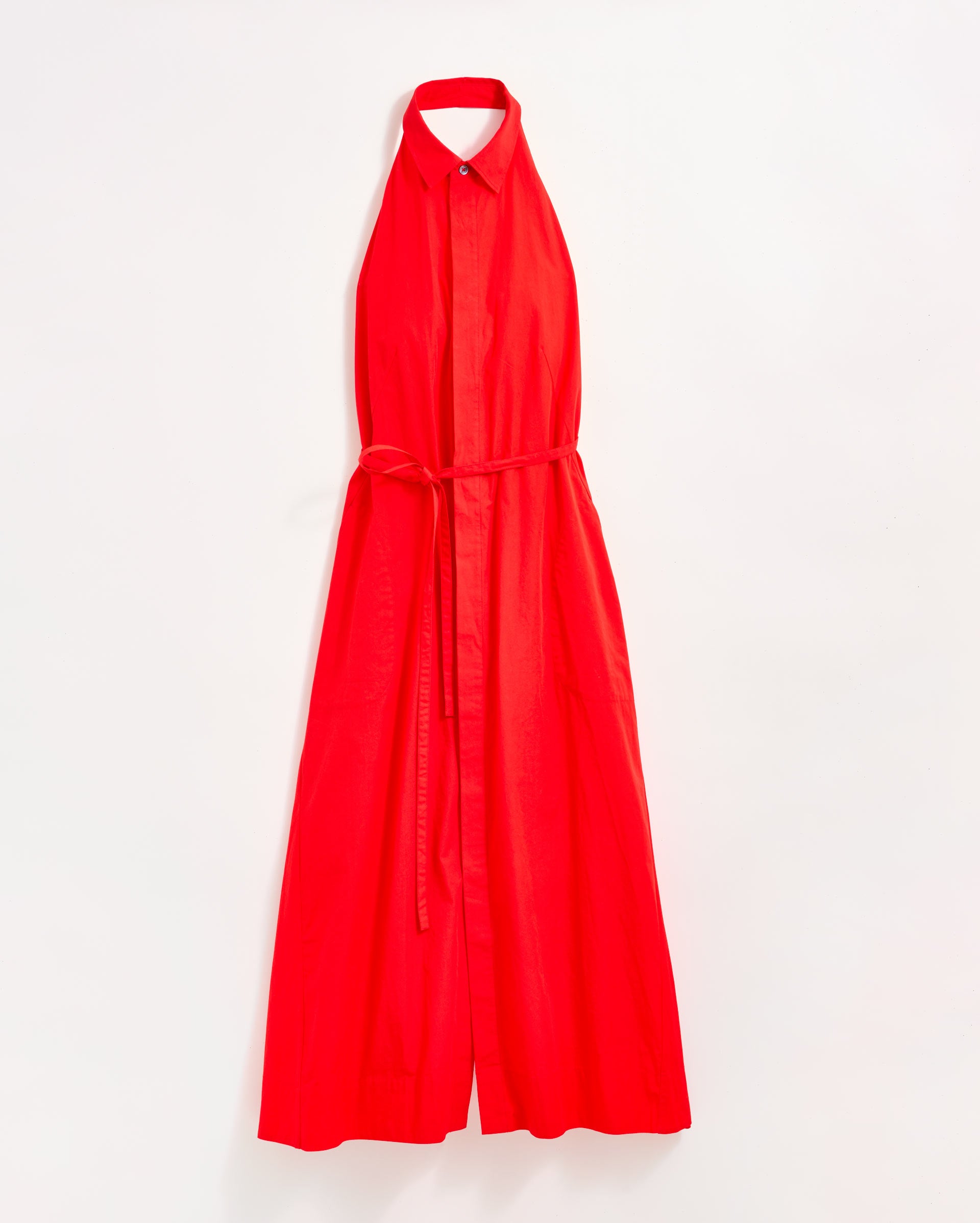 This classic halterneck dress will be ready to go wherever you do this season. Cast in a lively flame color, the halterneck shape is elegant without losing an ounce of functionality—the dress still has two seam pockets to keep any phone or keys with you. Wear it with sandals by the pool or heels for a night on the town.