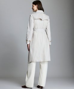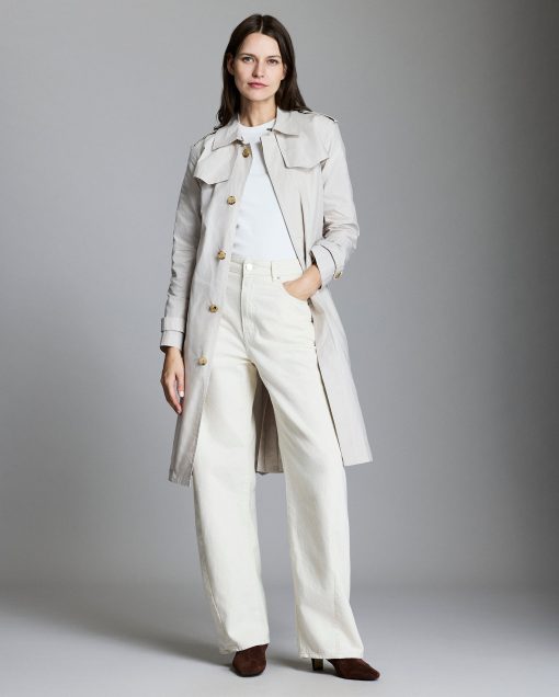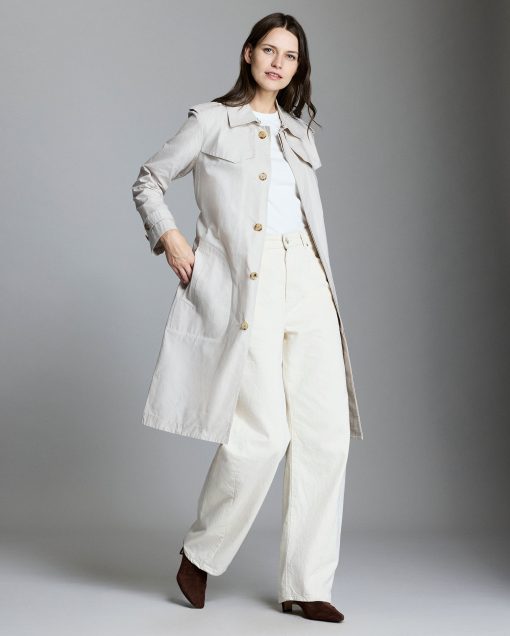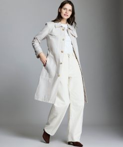 A trench coat goes with everything. This sophisticated, timeless style is ready to elevate any wardrobe choice. It’s not double breasted, so the closure is relaxed and loose to pull on over a jacket or simple tee and jeans. Our take on the classic coat also skips the dramatic lapel and instead offers a storm flap with our signature spade pocket. The piece is also cast in special fabric from our friends in Scotland at Halley Stevensons; inspired by the women’s coats of the 1960s.